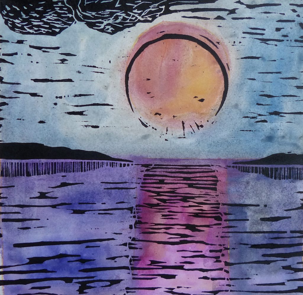 „Der Mond“ / 2019 / Holzschnitt und Aquarell 30 x 30 cm