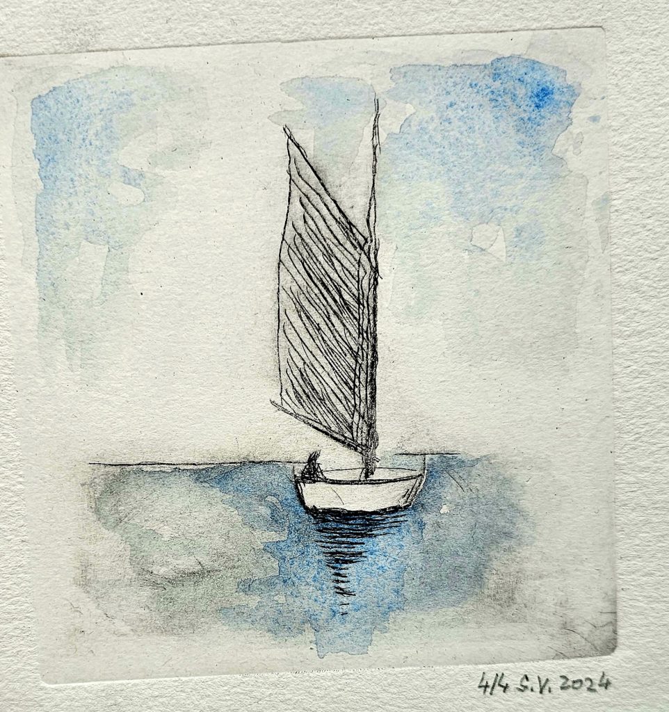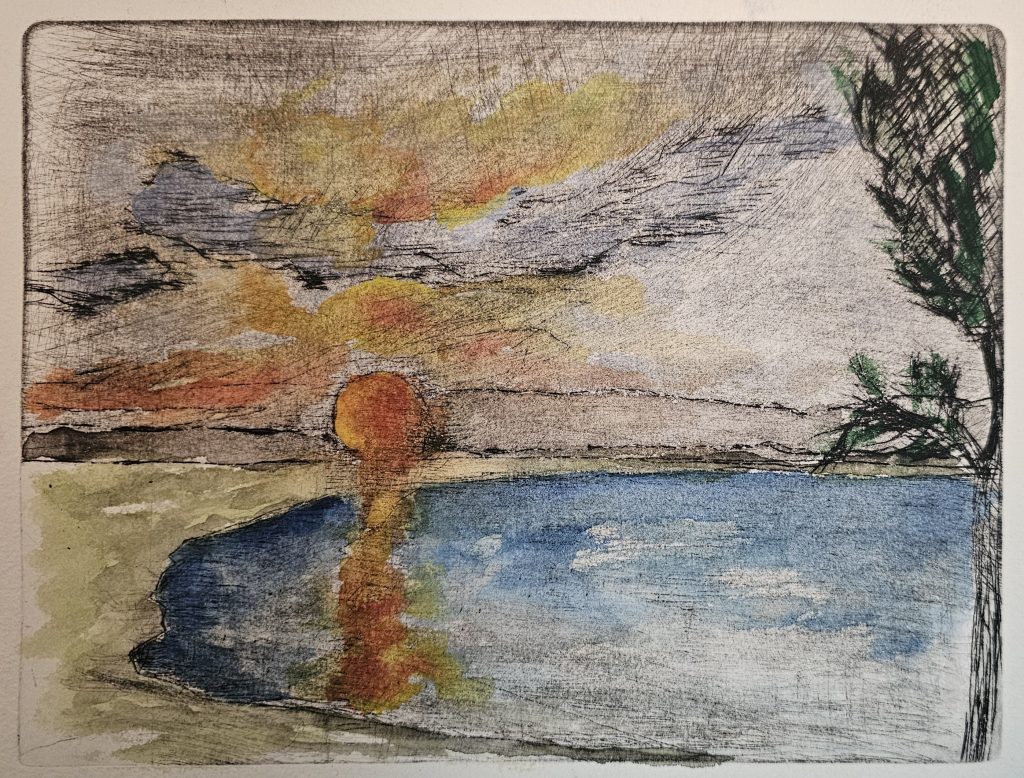 „Und hinter uns der Horizont / 2020 / Kaltnadelradierung auf Bütten, coloriert 30 x 24 cm