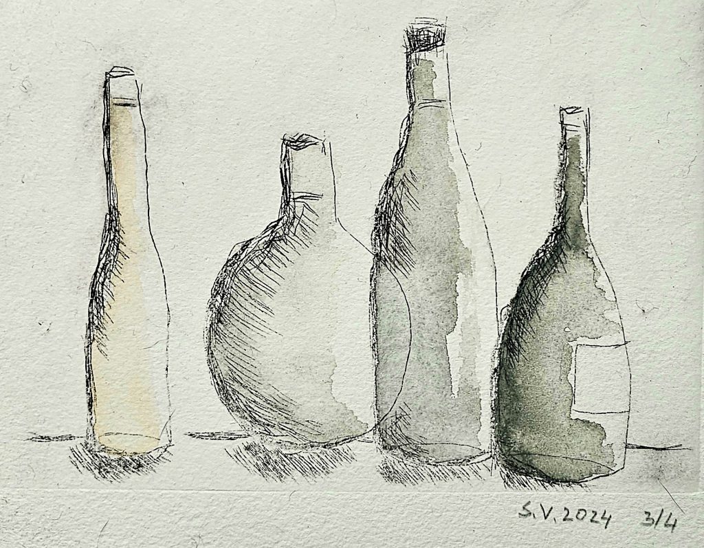 „Vier Flaschen“ / 2024 / Kaltnadelradierung auf Bütten. coloriert 30 x 24 cm