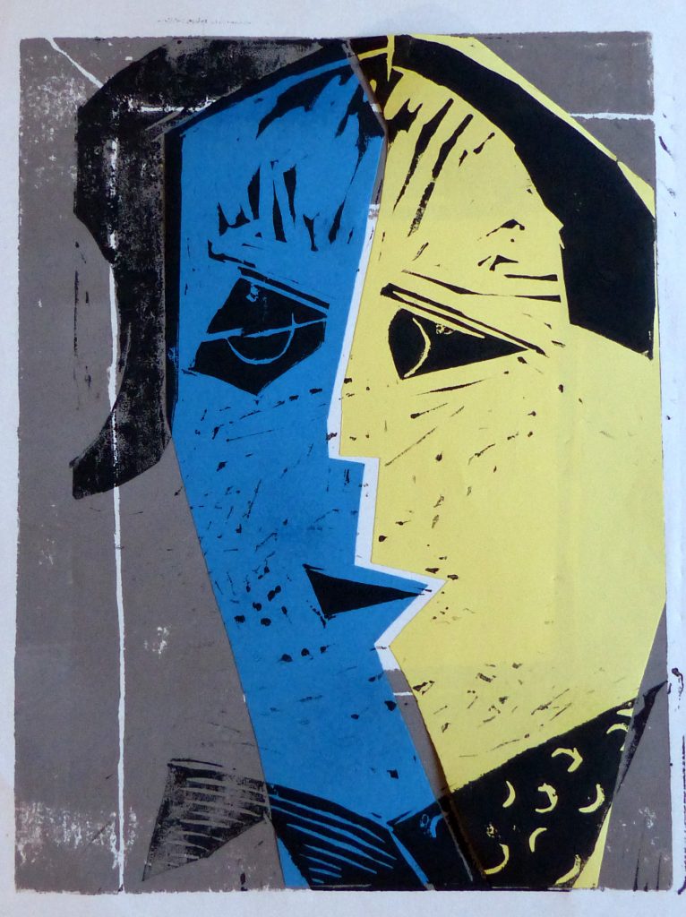 „Doppelportrait “ / 2019 / Linolschnitt mit Farbflaechen 21 x 30 cm